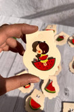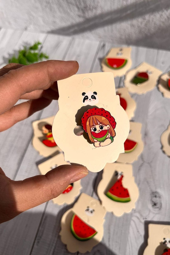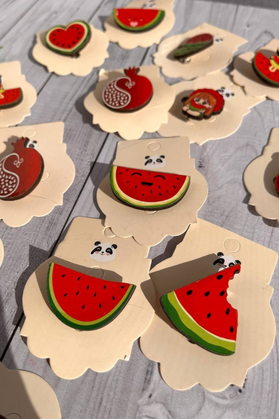 پشت کار سنجاق دارد که روی مقنعه و لباس و کیف سنجاق میشود.