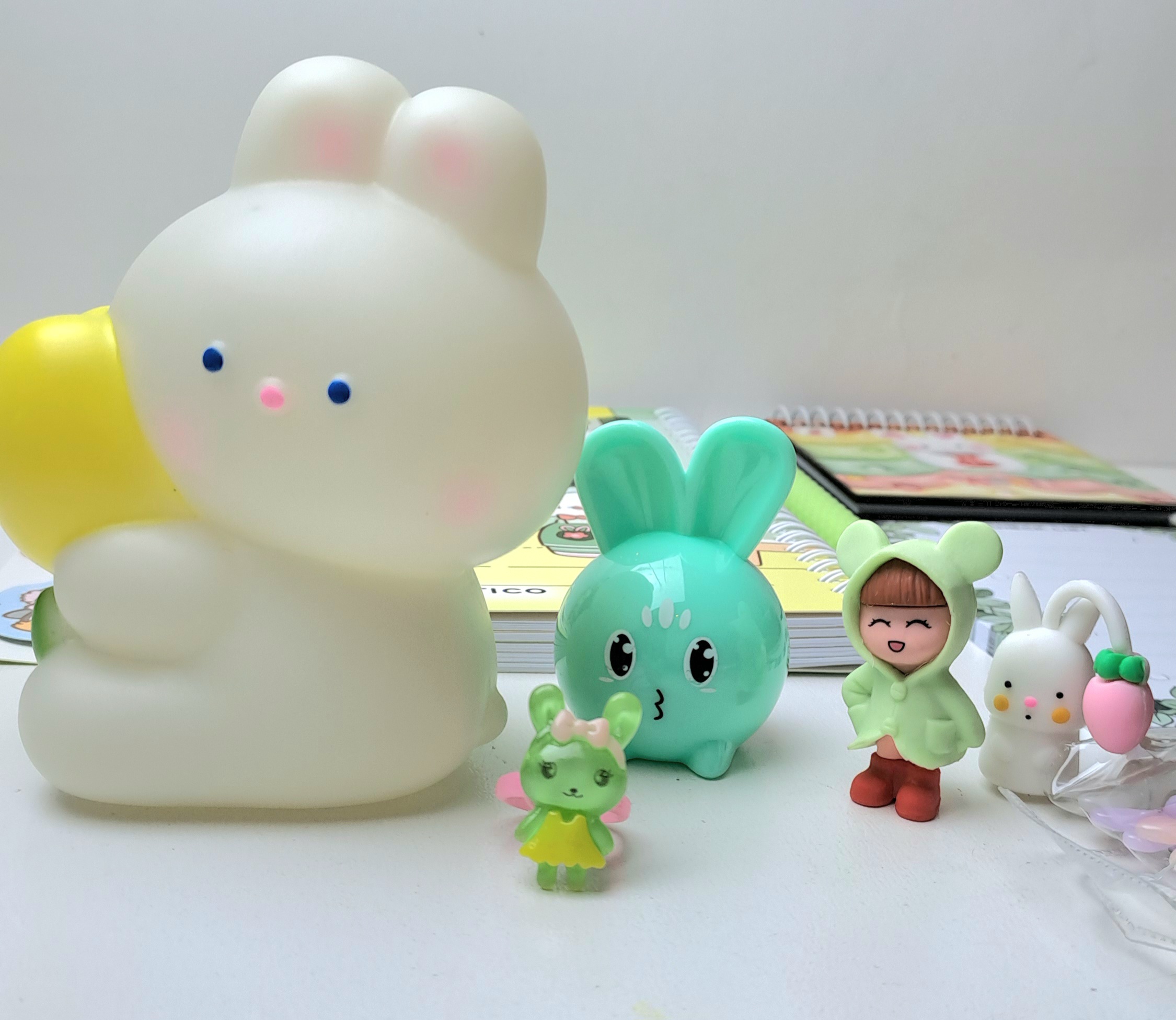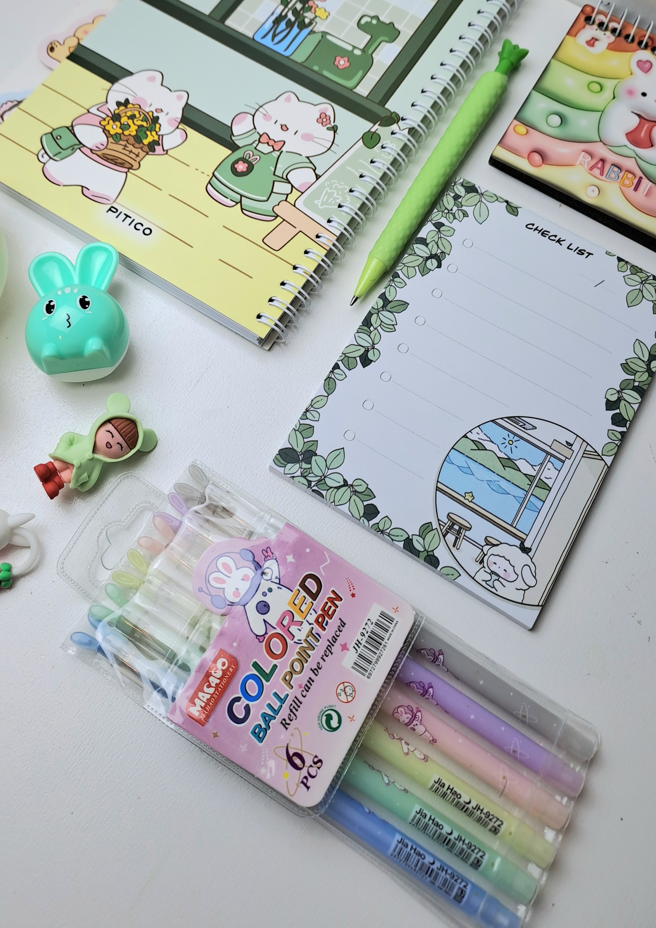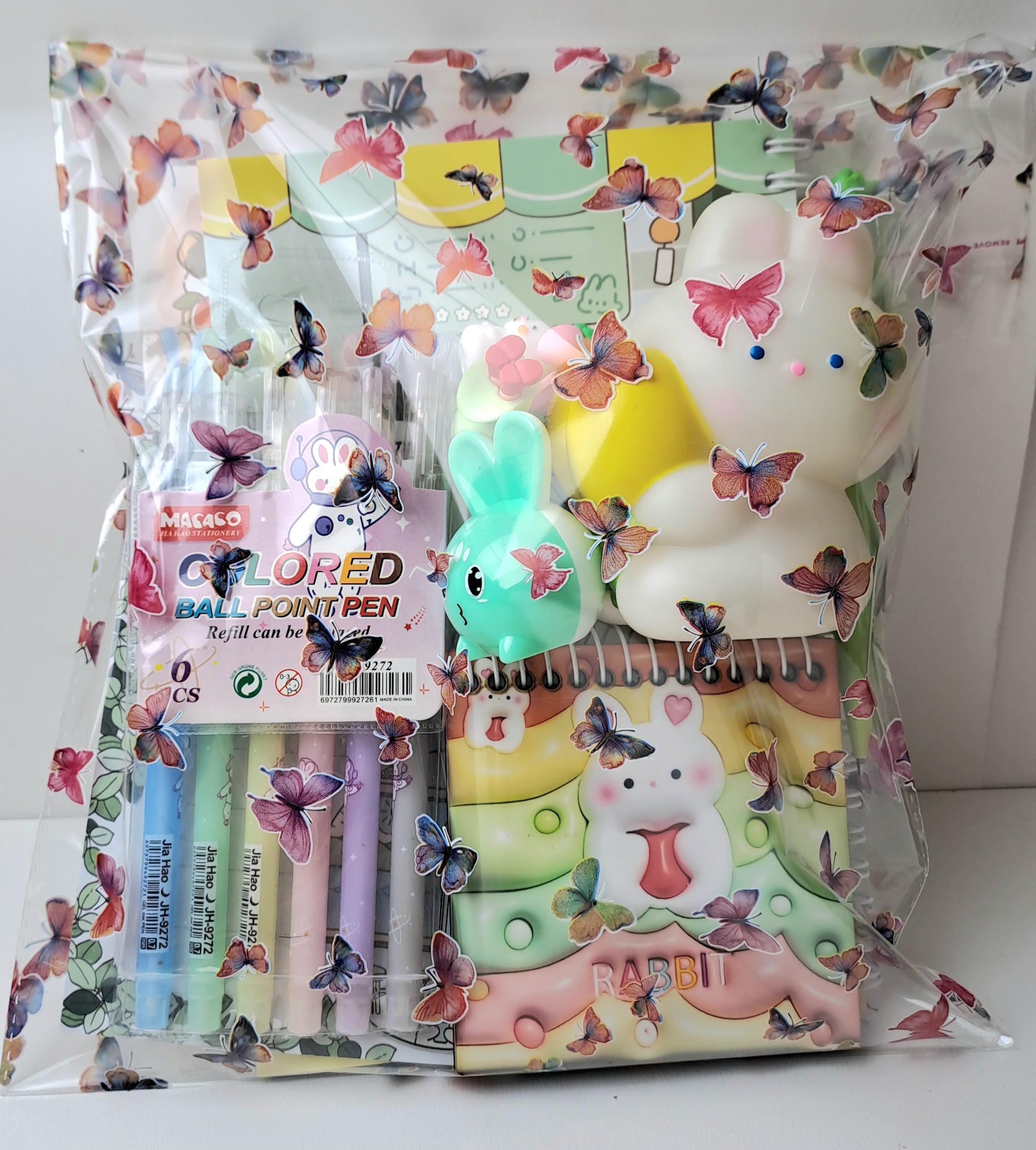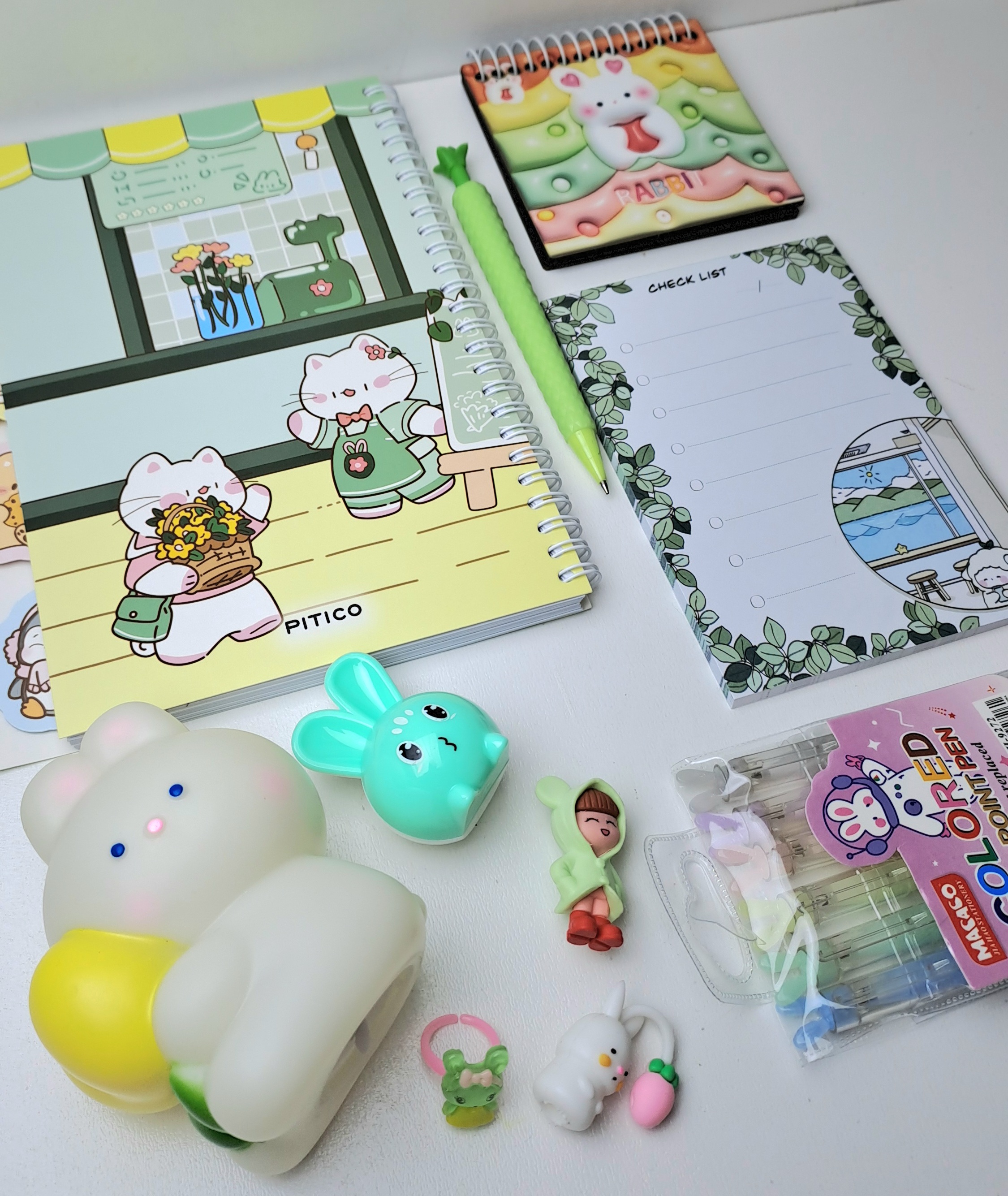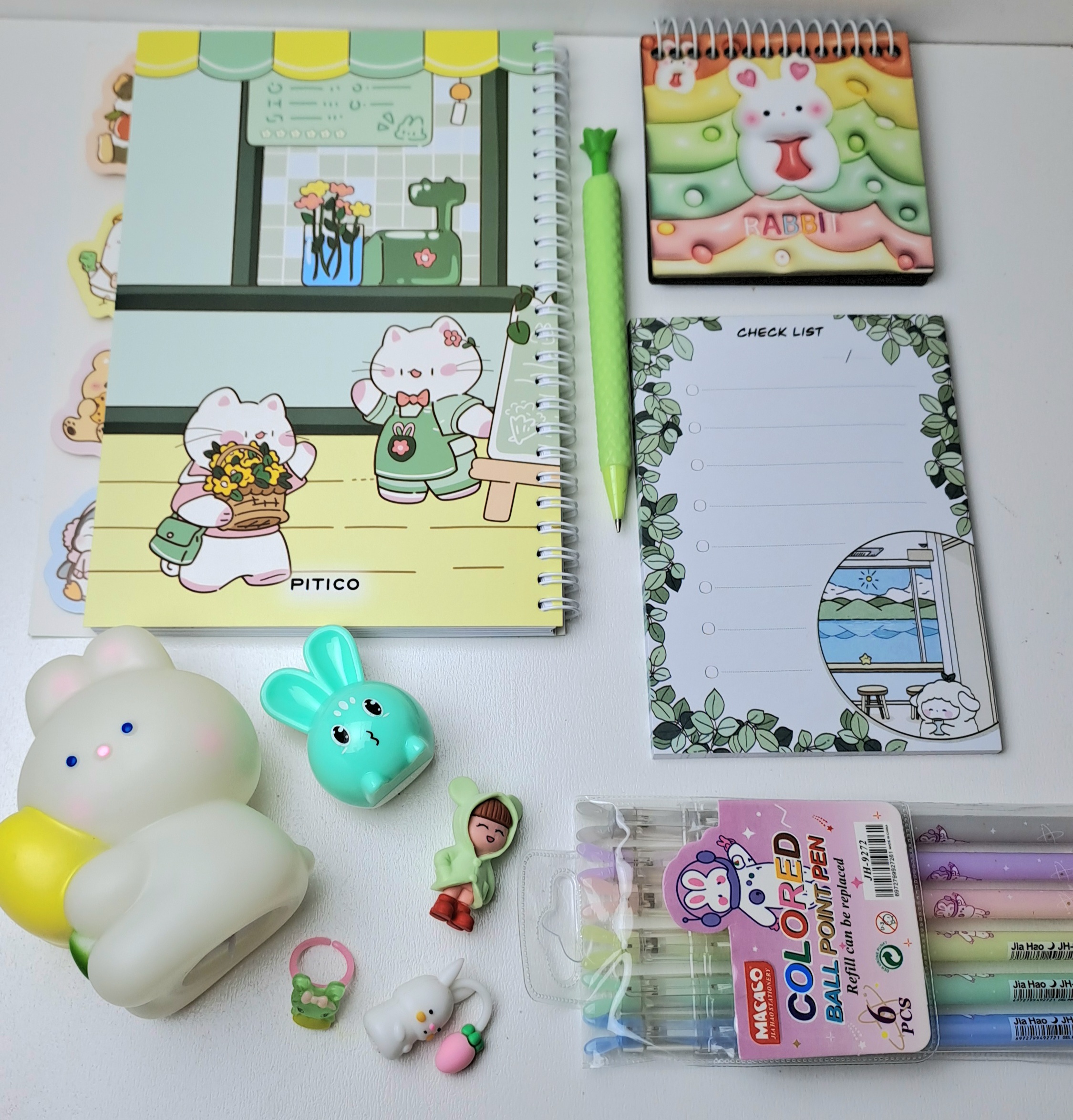 یه پک خرگوشیِ شامل: دفتر دیوایدردار لوکس دفترچه چوبی نوت پد سایز بزرگ پک ۶رنگ خودکار خرگوشی چراغ خواب خرگوشی تراش مخزن دار پاکن سرمدادی انگشتر خرگوشی اتود بسته بندی پک با سلفون پروانه ای